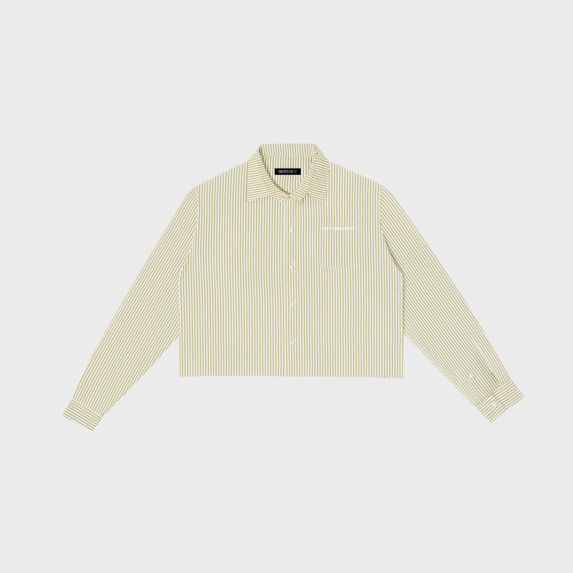 Camisa unisex confeccionada en algodón ligero con un patrón de rayas verticales tonales en oliva, que evoca una estética retro y sofisticada. Su silueta cropped reinterpreta un clásico con un giro contemporáneo.